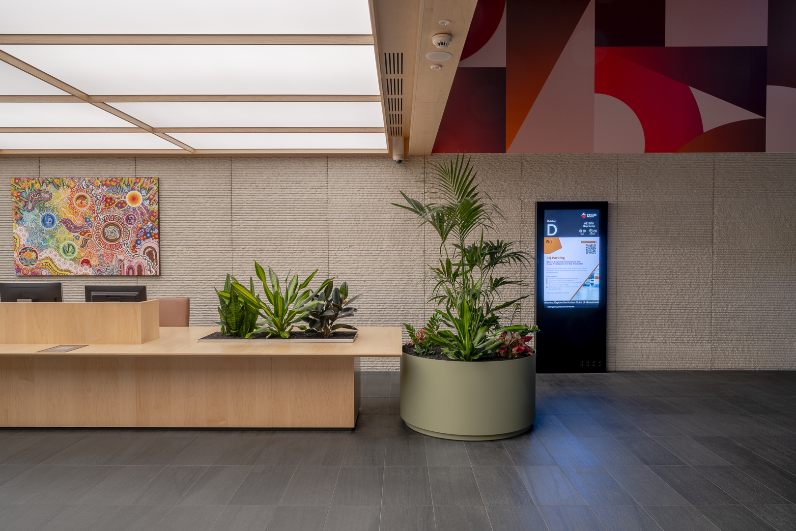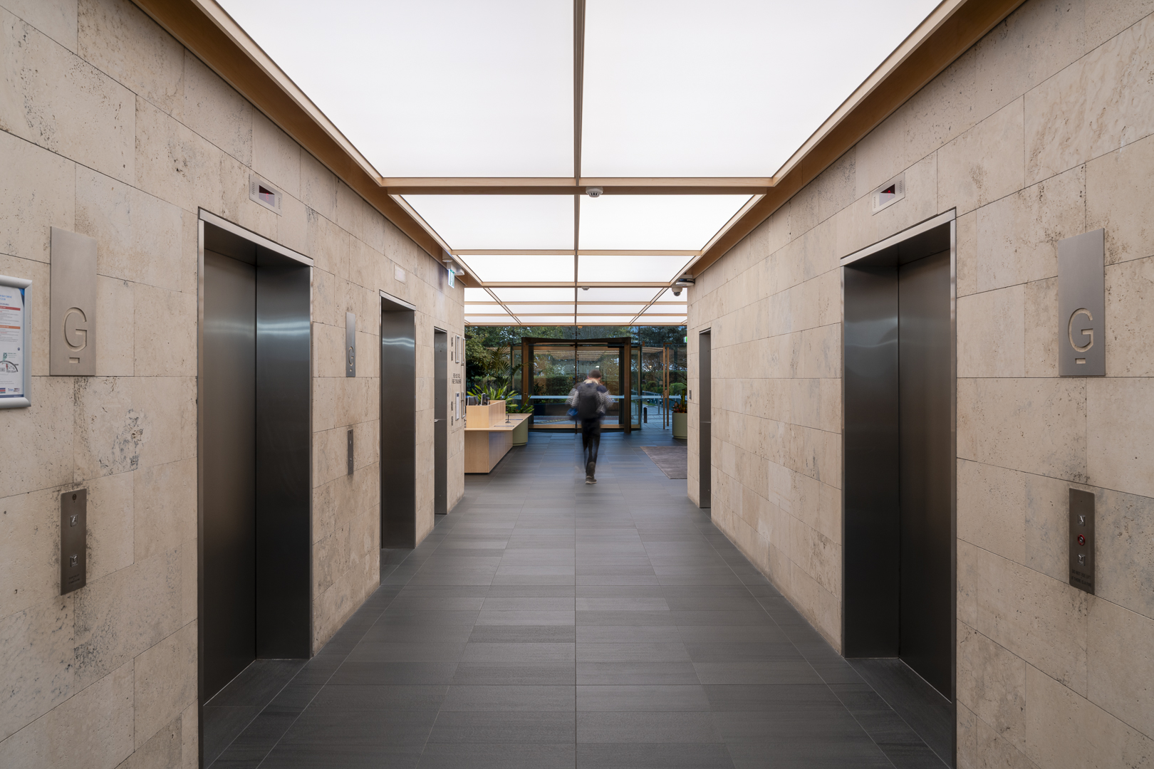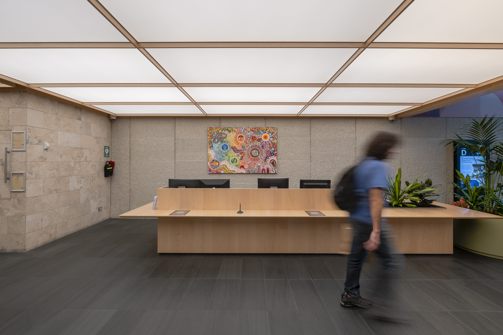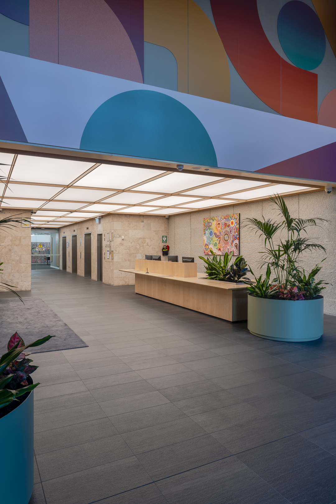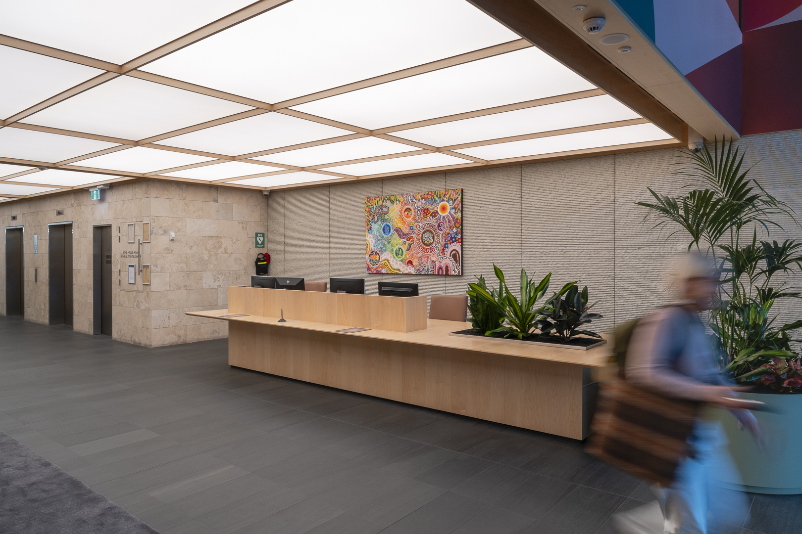 Revitalising a busy lobby area requires a fine balance, maintaining accessibility while not spoiling the grand reveal. We worked overnight over eight weeks to rejuvenate the dated lobby for commercial property company Frasers Property Australia, enhancing the reception and lift lobby. This involved demolishing the existing ceiling and joinery and installing a new back-lit stretch fabric and wood joinery ceiling, with all new services carefully coordinated. The fresh, modern result brought a new lease of life to the building’s shared spaces.