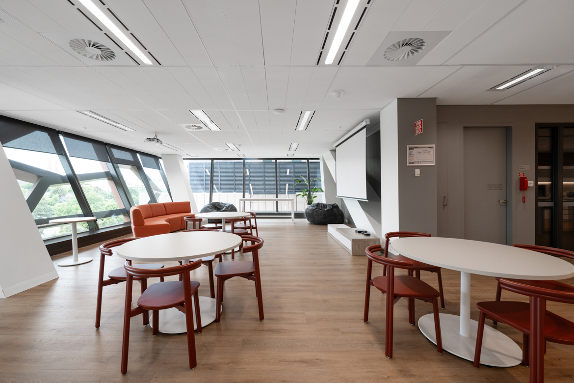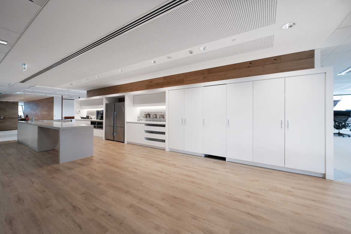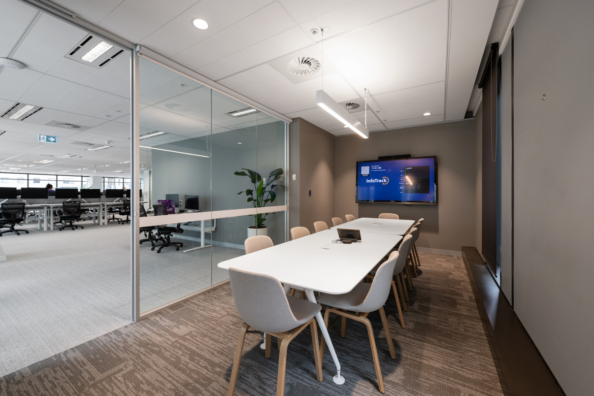 An open, collaborative workplace today needs to anticipate future business growth. For InfoTrack’s Sydney office, we drew on our existing relationship with the company to create a contemporary workspace with flexibility. International Tower 2’s high-level management systems required thorough coordination and strategic planning among the project team. This way we were able to demolish outdated spaces and finishes and supply and instal 253 workstations, furniture, kitchen joinery, new collaboration spaces, wall panelling and refreshed finishes, as well as relocating services