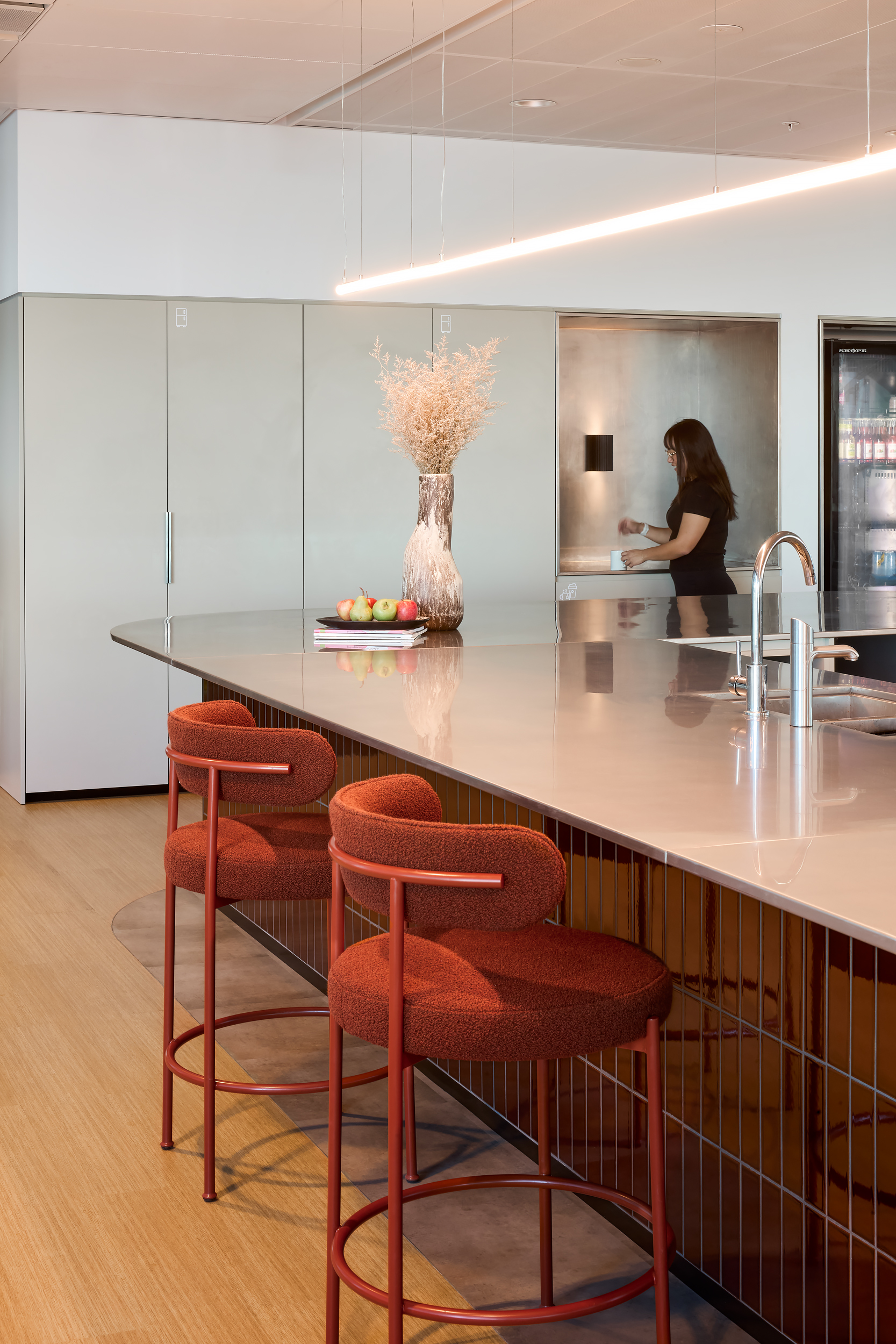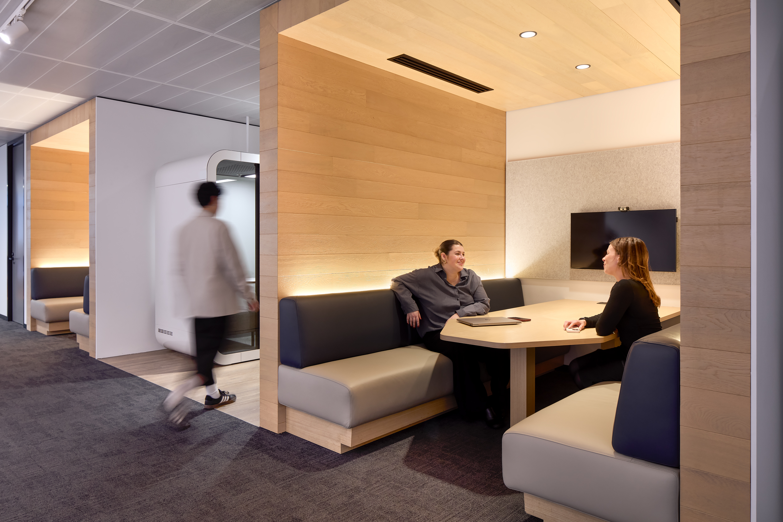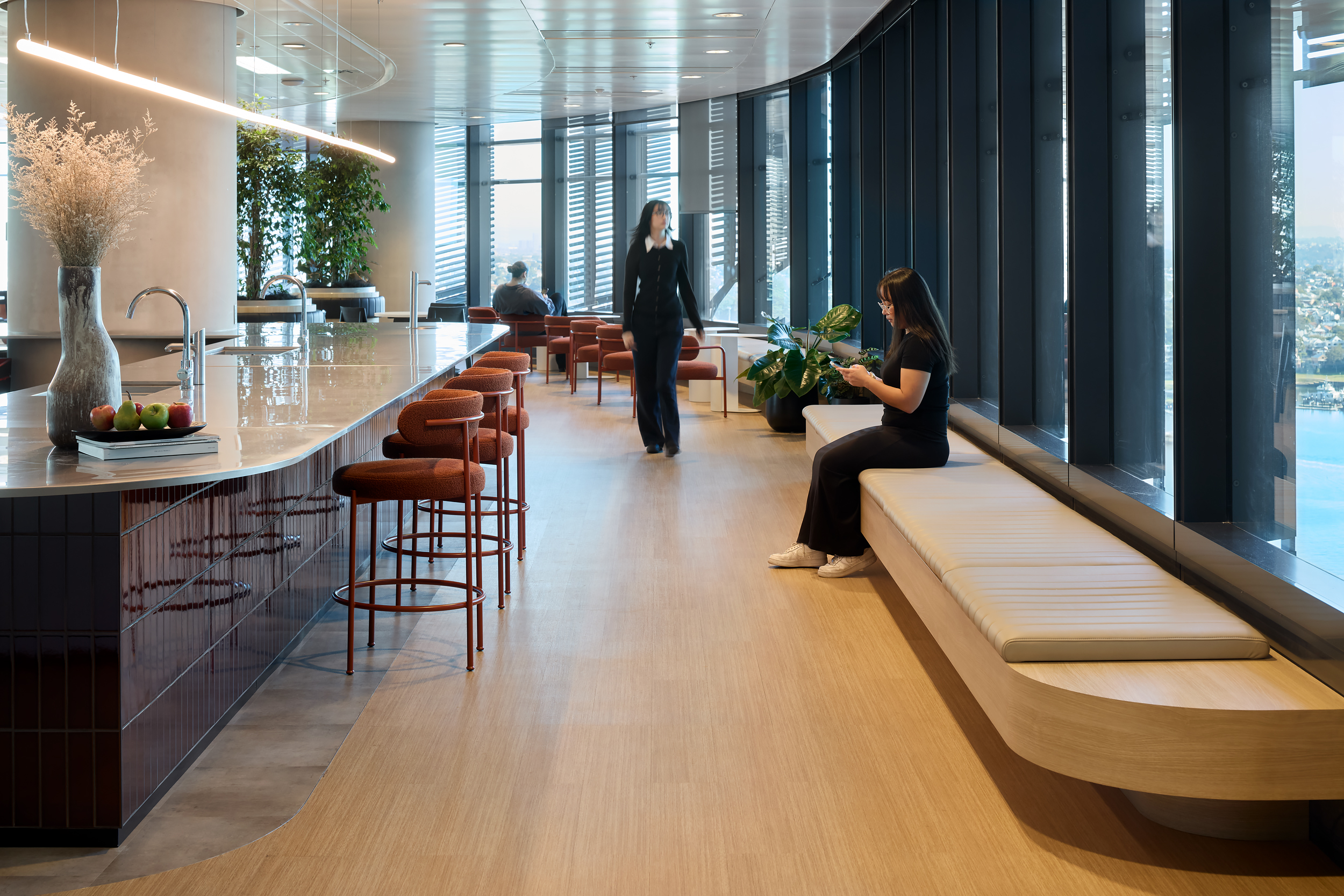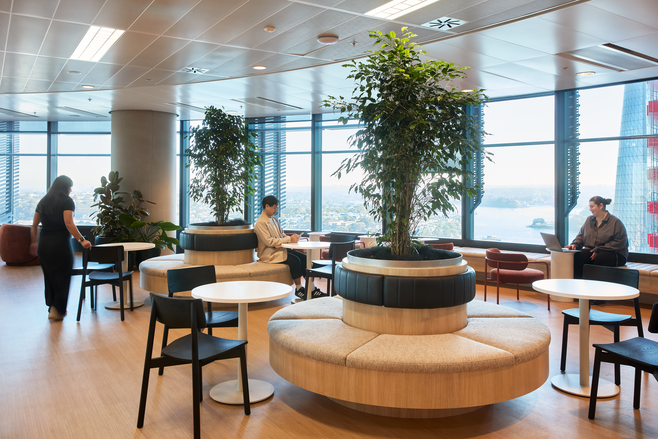 An open, collaborative workplace today needs to anticipate future business growth. For InfoTrack’s Sydney office, we drew on our existing relationship with the company to create a contemporary workspace with flexibility. International Tower 2’s high-level management systems required thorough coordination and strategic planning among the project team. This way we were able to demolish outdated spaces and finishes and supply and instal 253 workstations, furniture, kitchen joinery, new collaboration spaces, wall panelling and refreshed finishes, as well as relocating services
