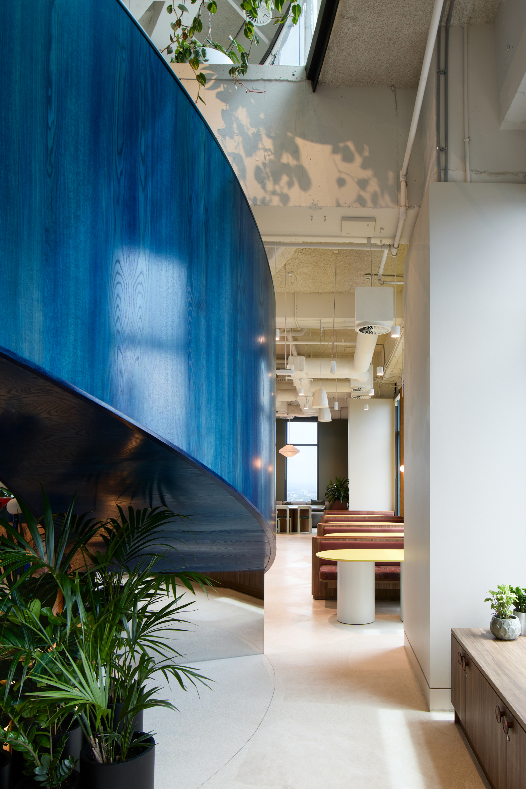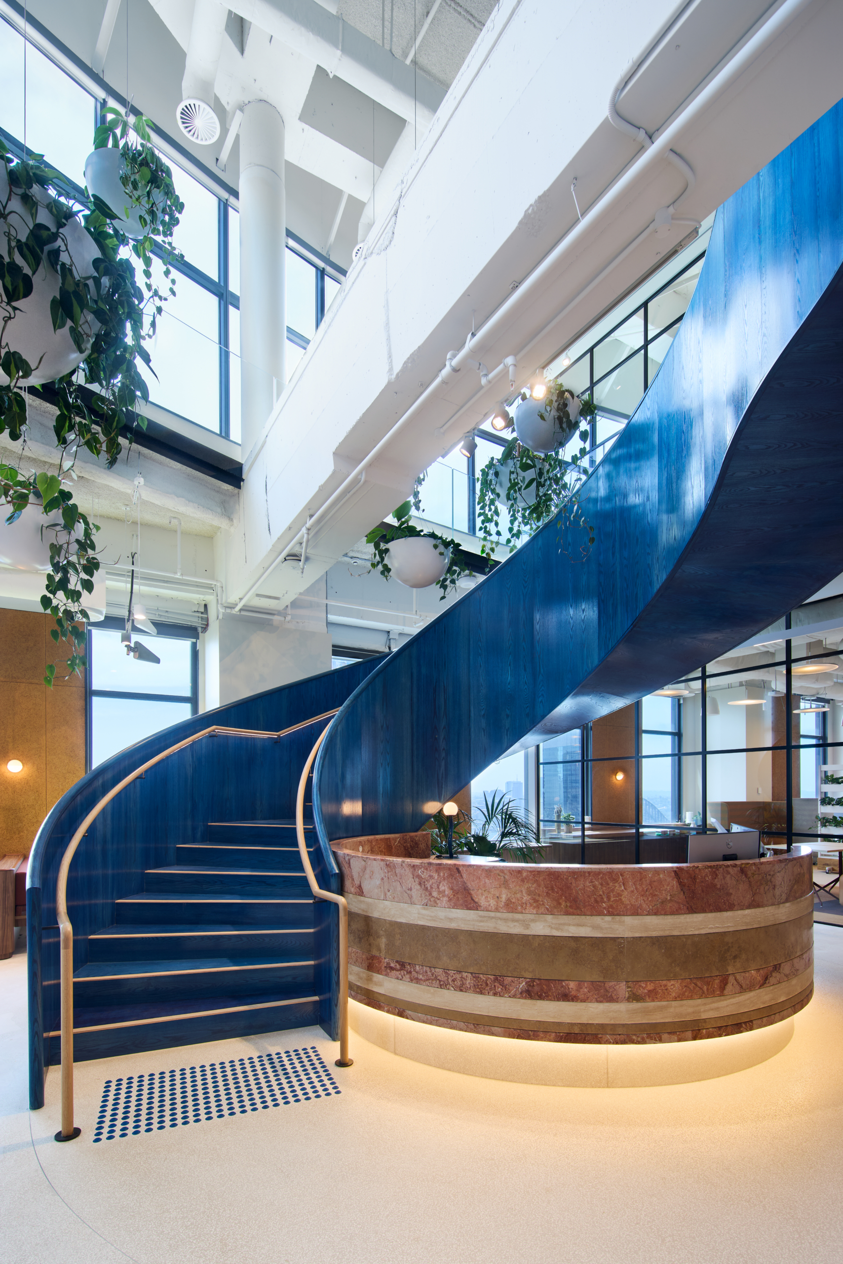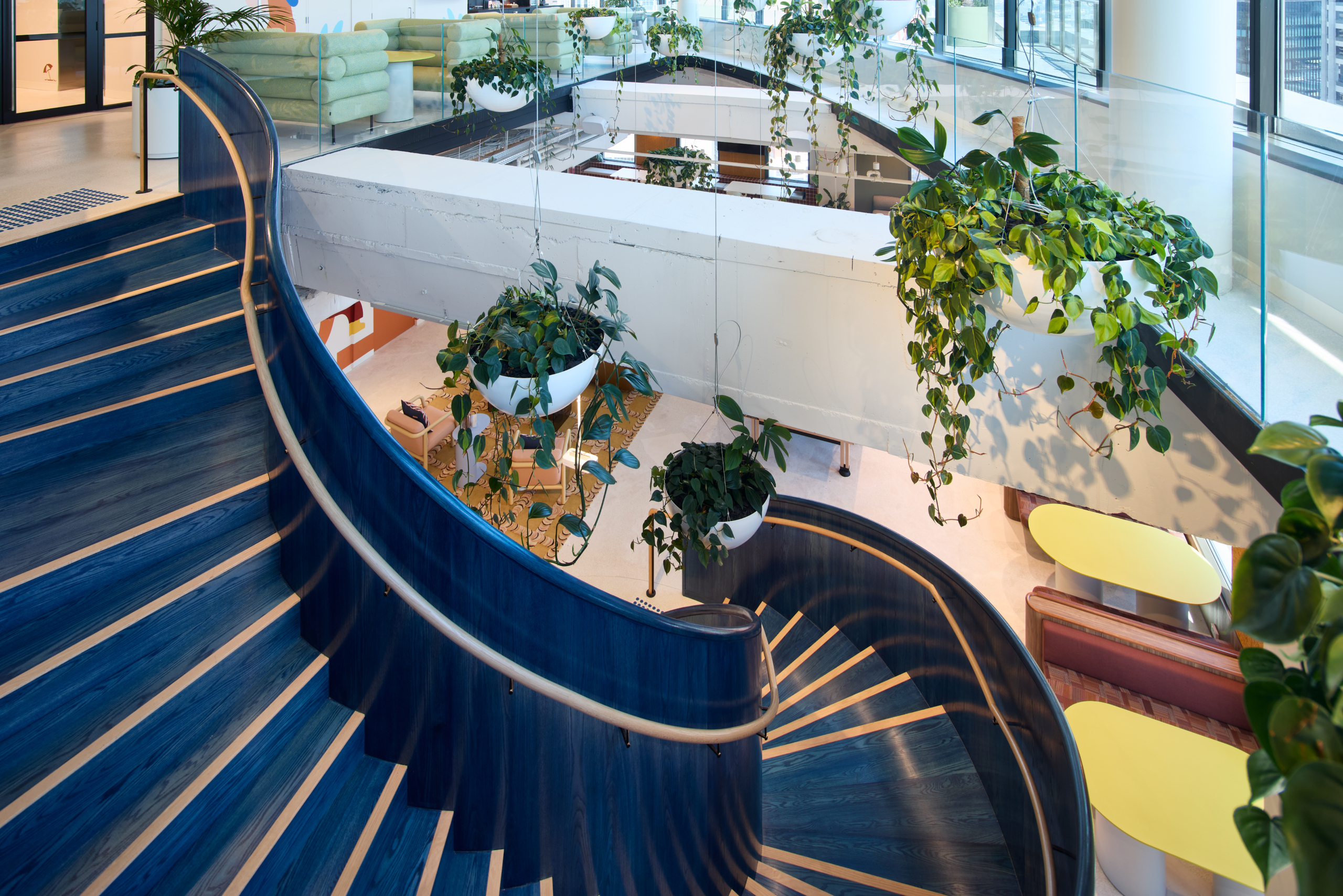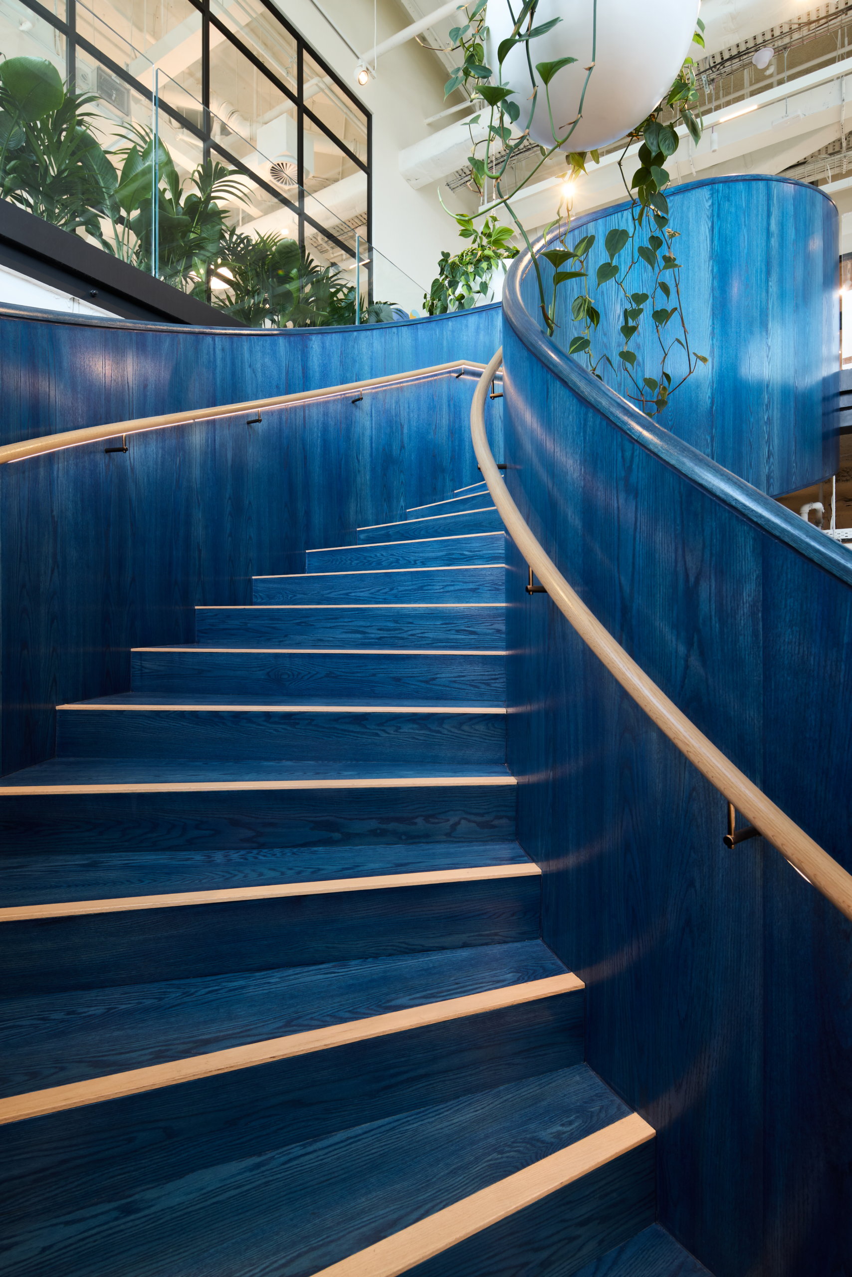 A defining feature of the workplace is the complete demolition of the existing stair and its replacement with a custom curved blue oak stair, forming a central sculptural element within the space. The stair captures and refracts natural light, anchoring the arrival experience and embodying the project’s intent to integrate materiality, form and identity into a single built outcome.