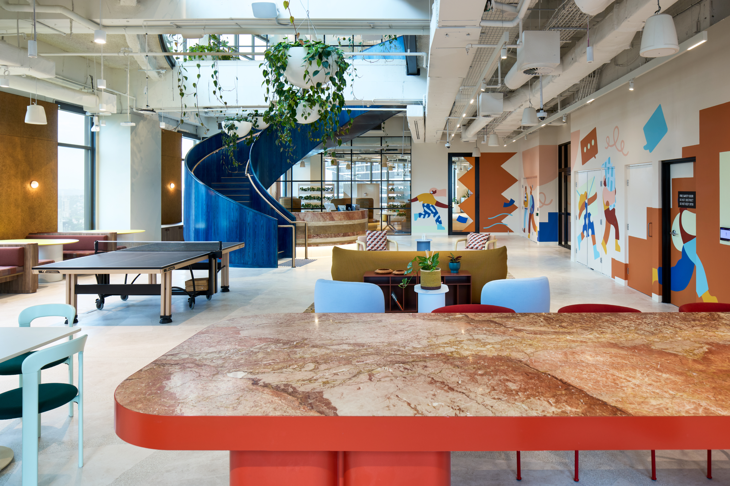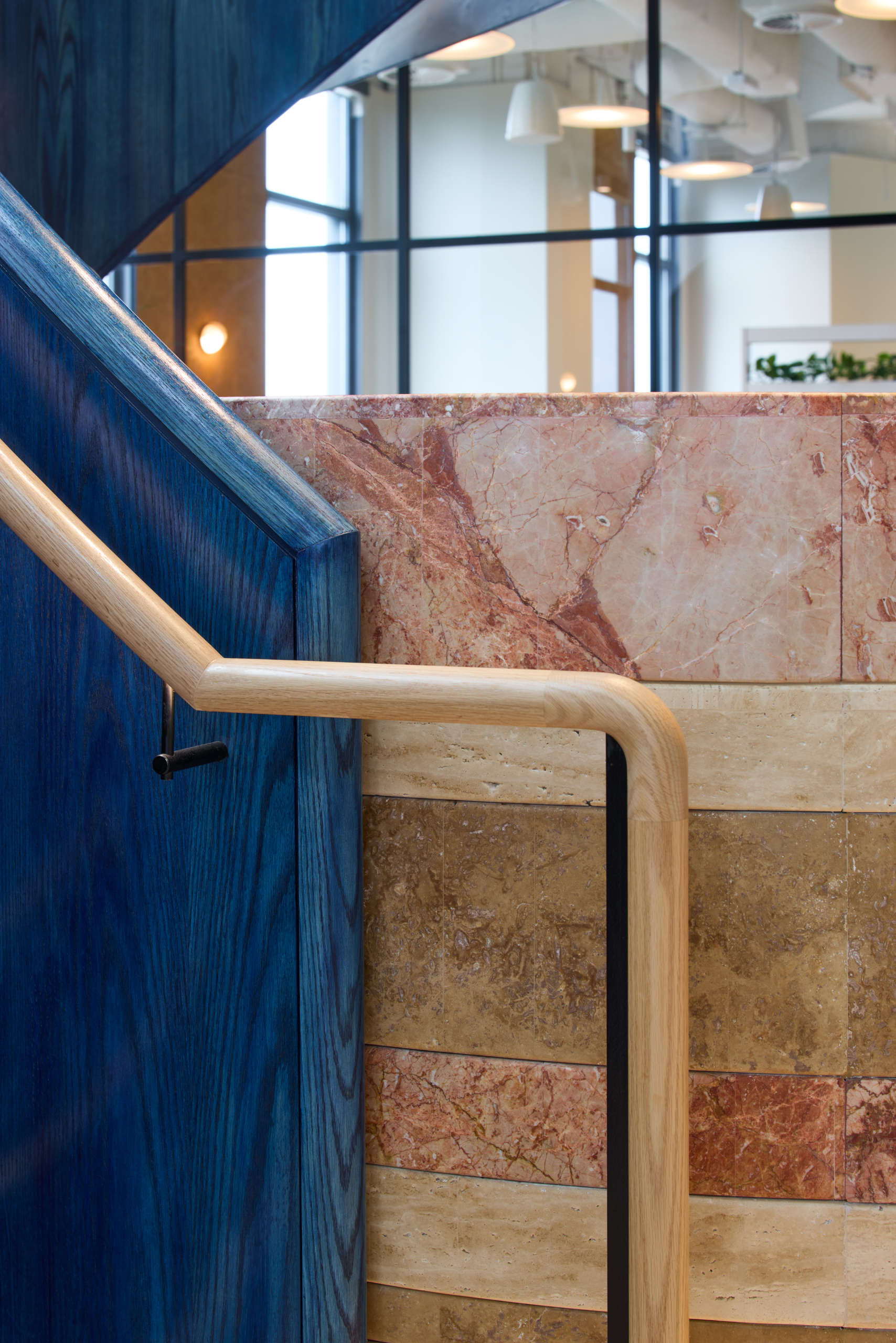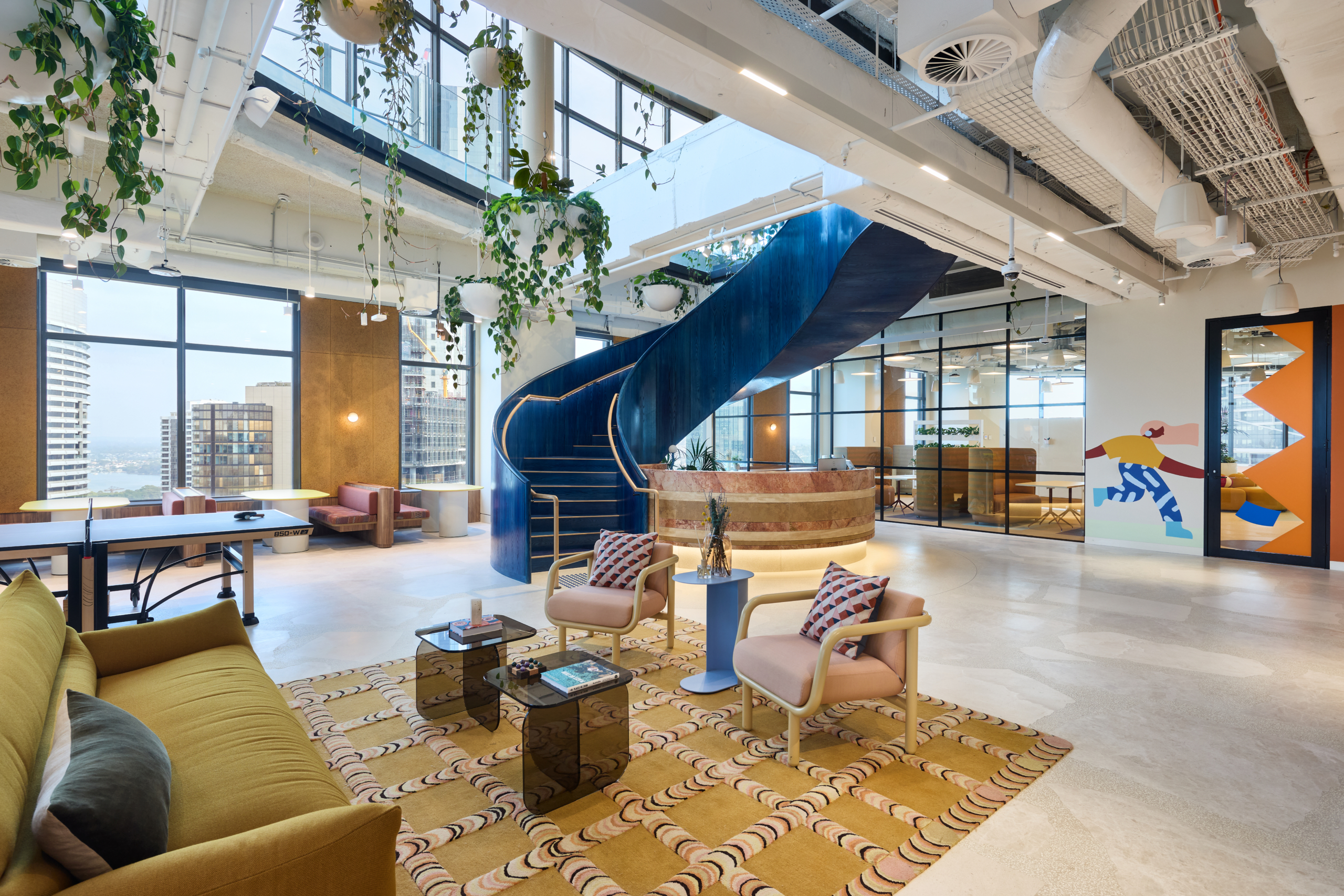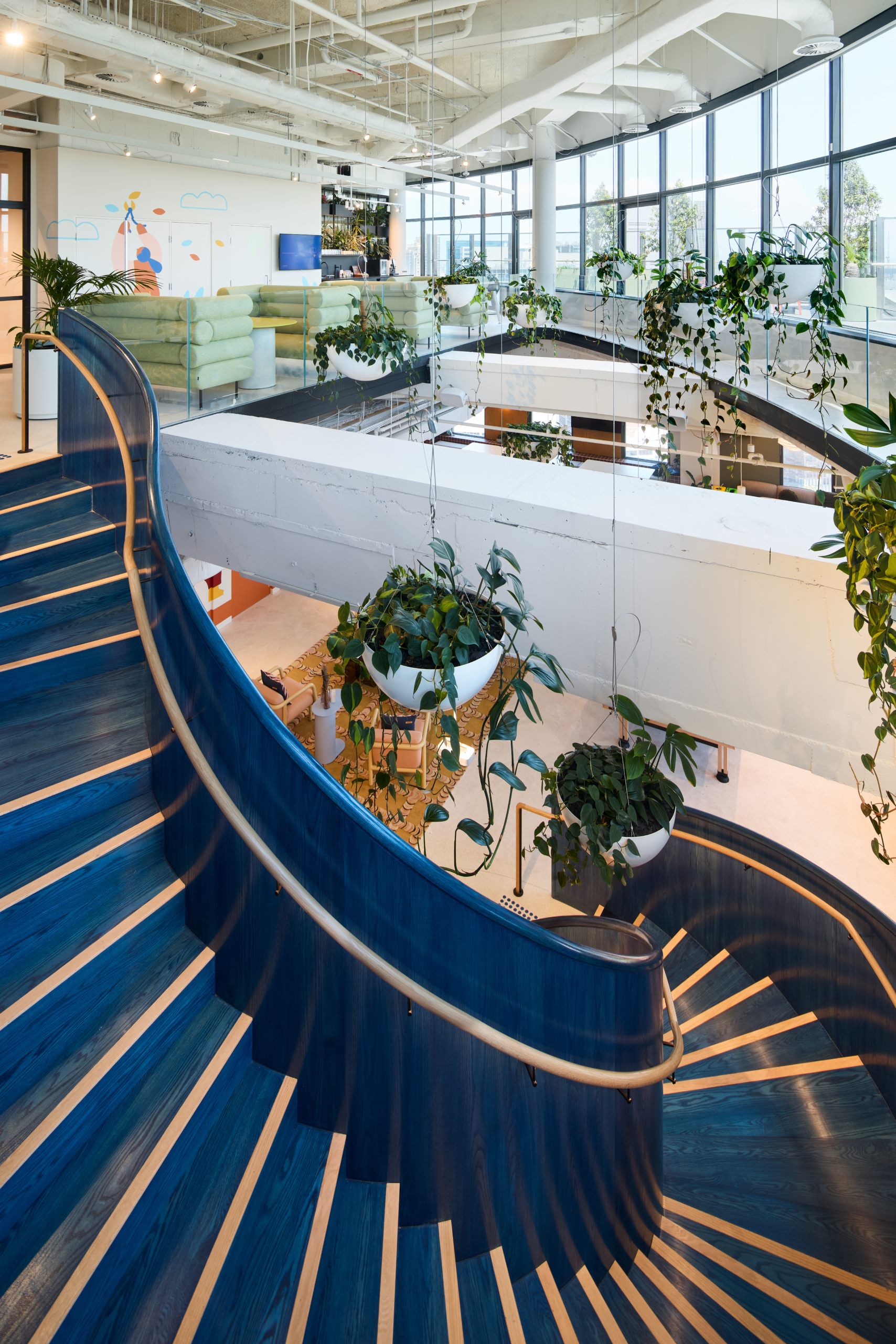 A defining feature of the workplace is the complete demolition of the existing stair and its replacement with a custom curved blue oak stair, forming a central sculptural element within the space. The stair captures and refracts natural light, anchoring the arrival experience and embodying the project’s intent to integrate materiality, form and identity into a single built outcome.