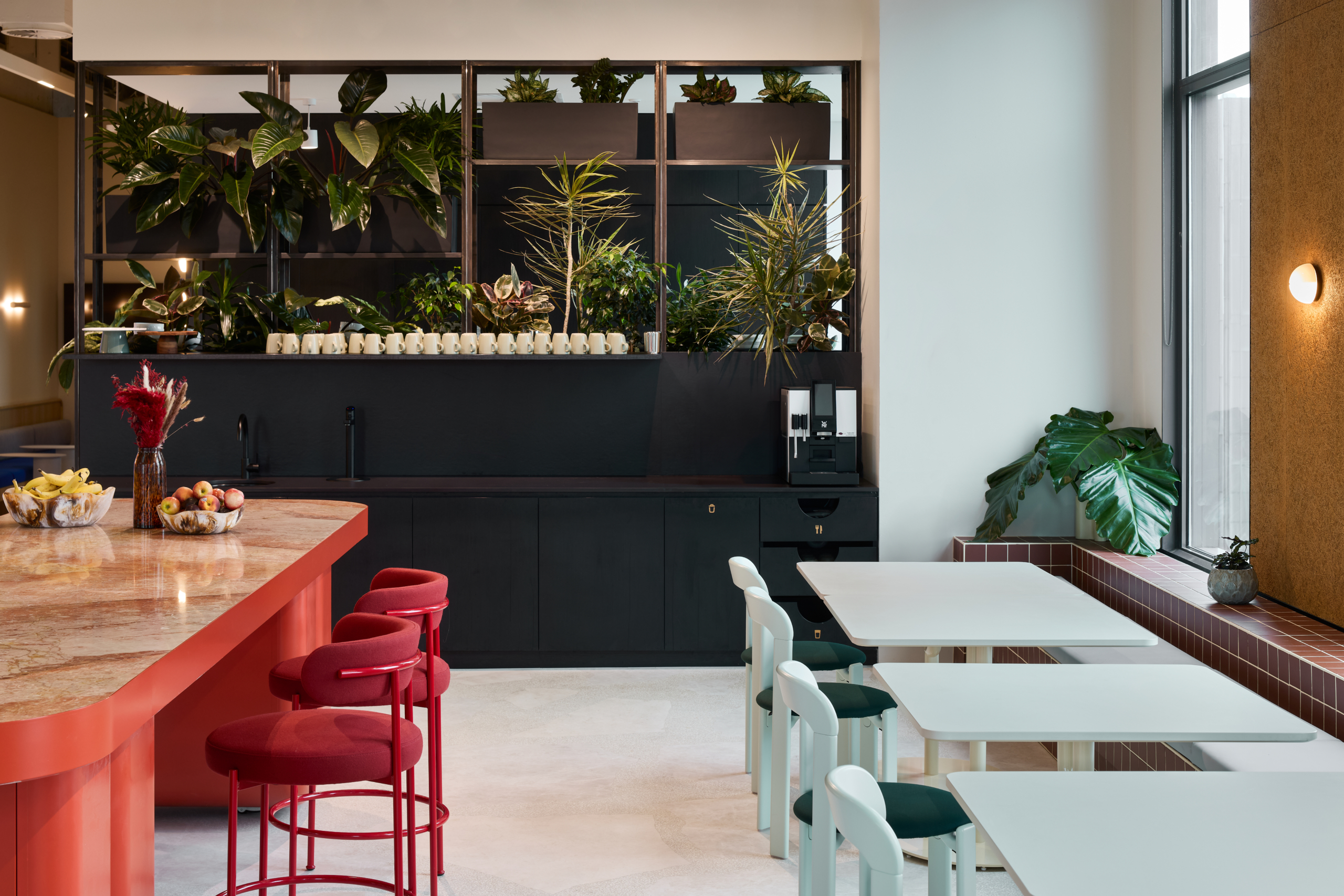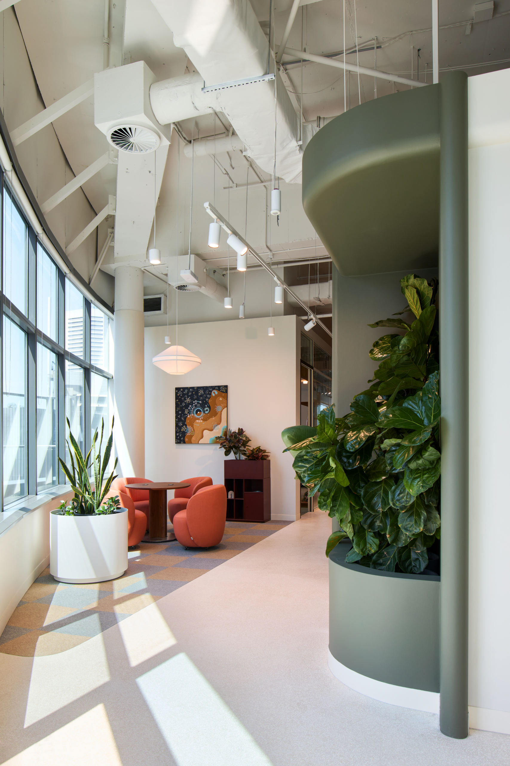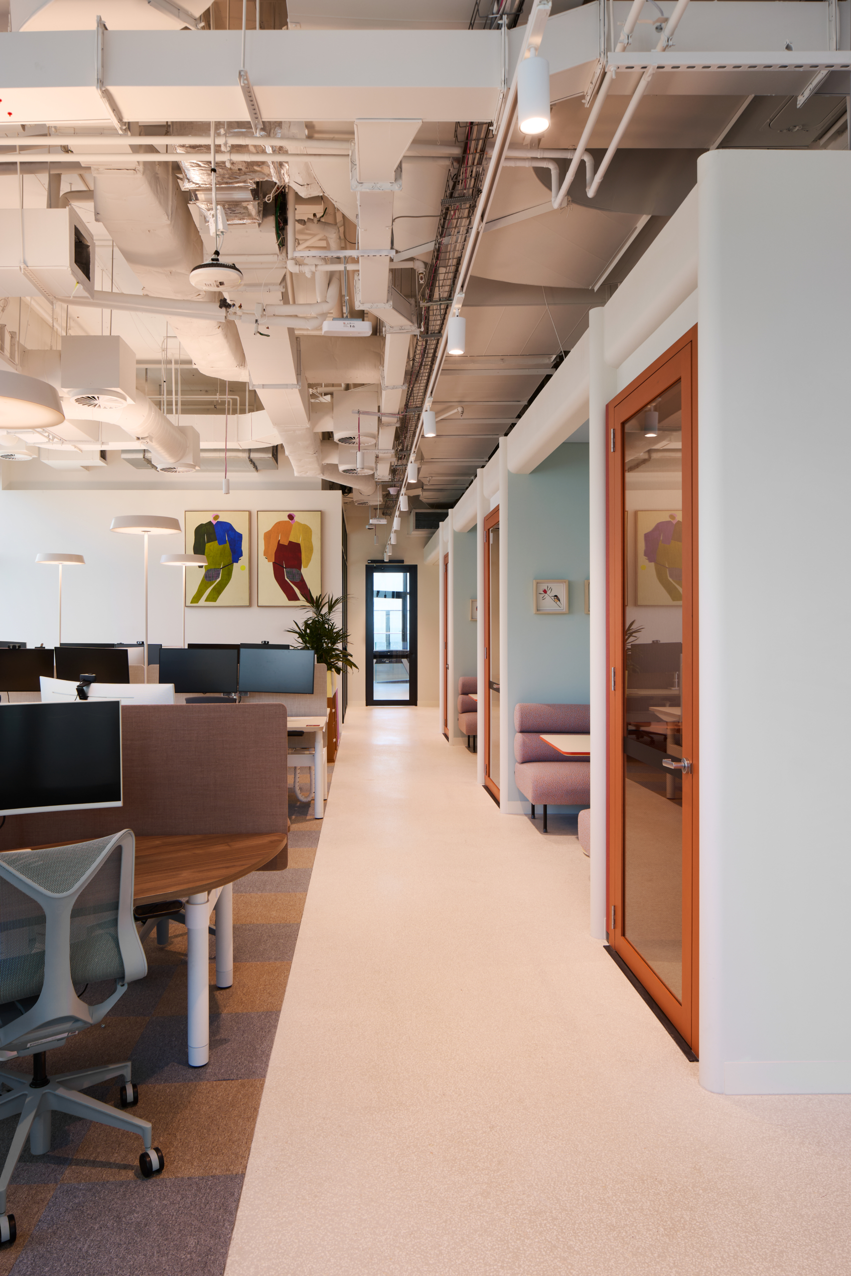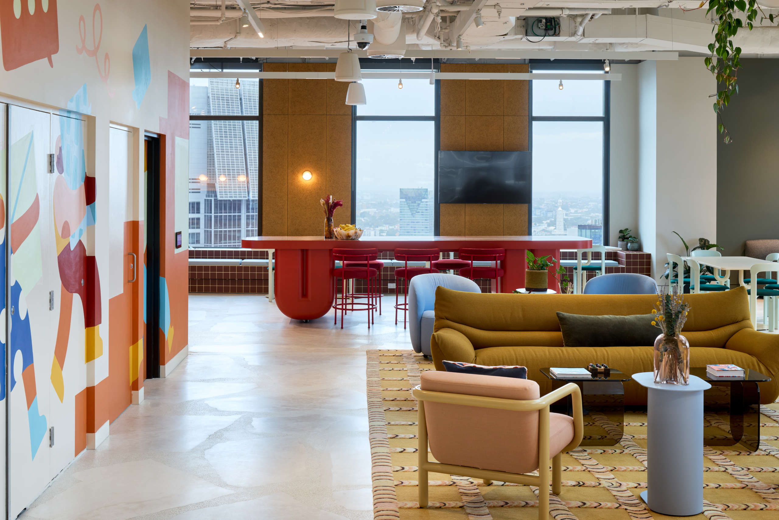 At the core of the project is the deliberate use of colour and light as constructed elements of the workplace. Rather than acting as decoration, colour was delivered as an architectural tool, defining space, guiding movement and reinforcing Intuit’s brand identity. Focus zones are expressed through calm, muted tones, while collaboration and event spaces are energised through bold colour and softer finishes, creating a clear yet intuitive transition between different modes of work.