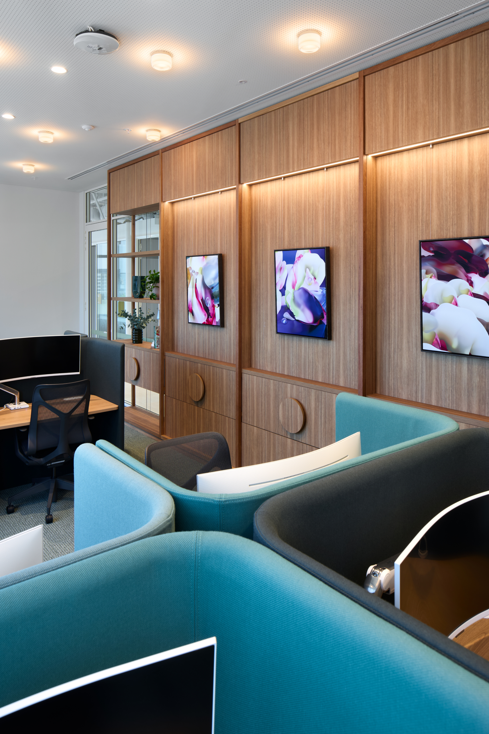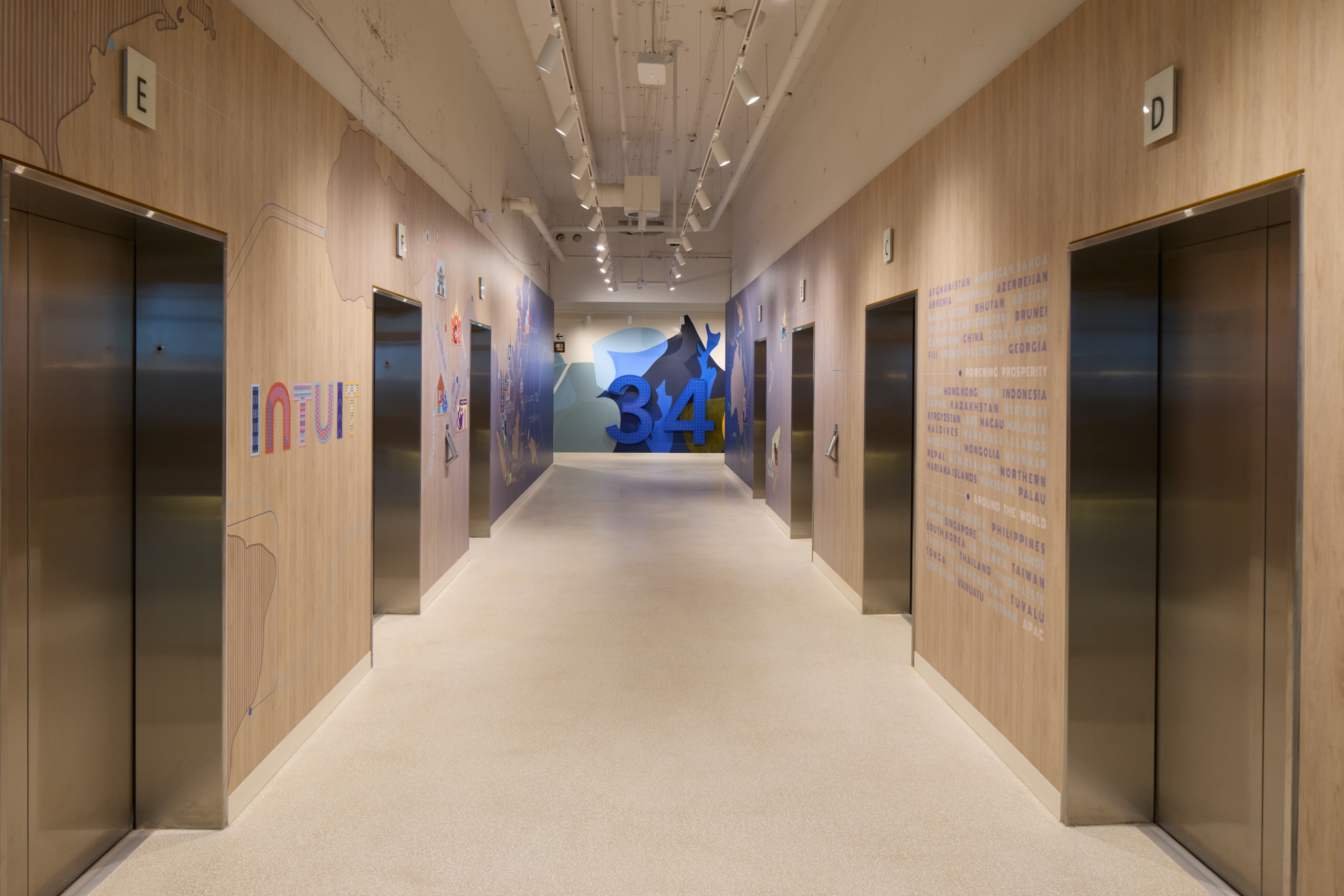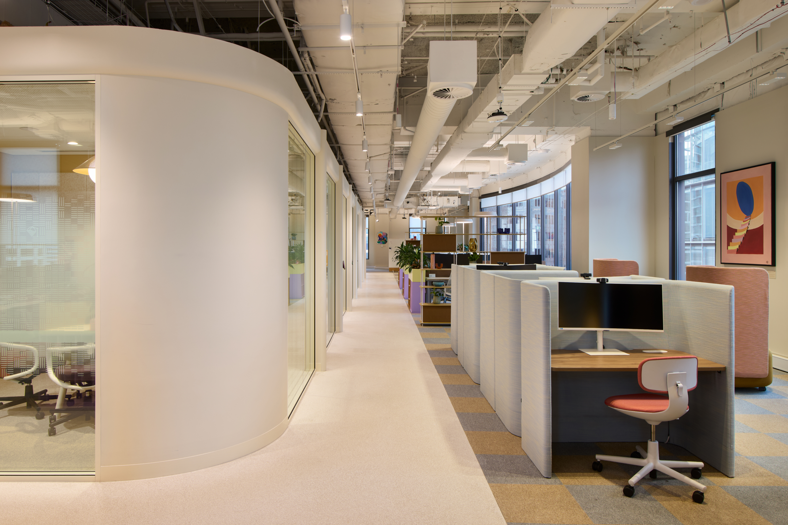 At the core of the project is the deliberate use of colour and light as constructed elements of the workplace. Rather than acting as decoration, colour was delivered as an architectural tool, defining space, guiding movement and reinforcing Intuit’s brand identity. Focus zones are expressed through calm, muted tones, while collaboration and event spaces are energised through bold colour and softer finishes, creating a clear yet intuitive transition between different modes of work.