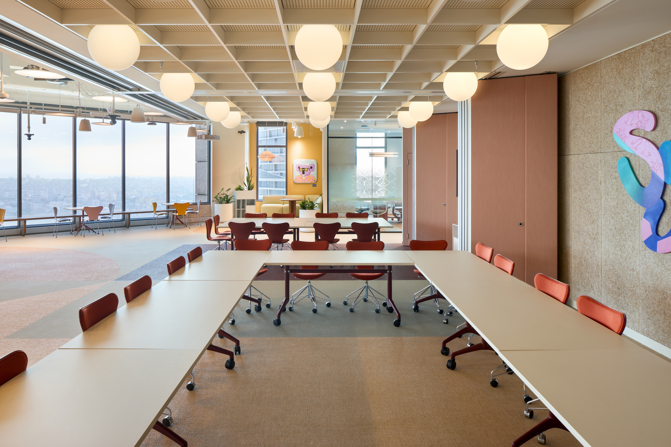 The project also includes the first installation of the Dorma Skyfold Prisma fully automated operable wall system in the Southern Hemisphere, enabling spaces to transform in real time to support collaboration, events and focused work. This is supported by high-performance acoustic environments, premium finishes including terrazzo flooring and timber feature ceilings, and fully integrated services, AV and security systems.